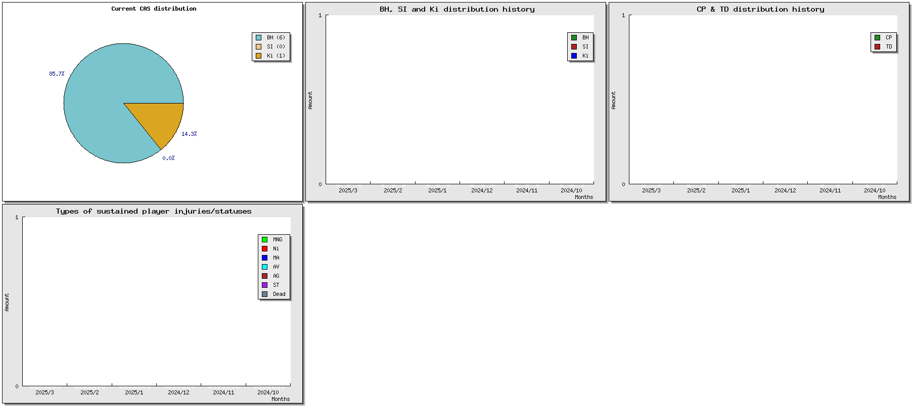 | Injuries | Tournament | Opponent | MVP | Cp | Td | Int | Cas | Score | Result | Date played | Match |