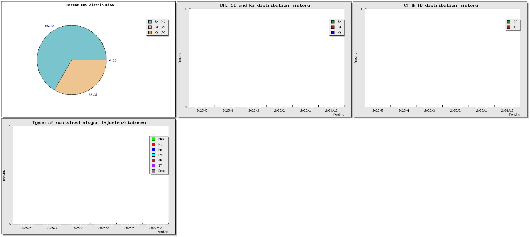 | Injuries | Tournament | Opponent | MVP | Cp | Td | Int | Cas | Score | Result | Date played | Match |
