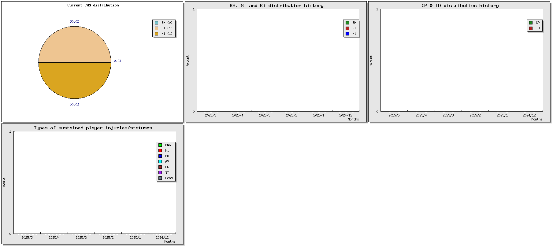 | Injuries | Tournament | Opponent | MVP | Cp | Td | Int | Cas | Score | Result | Date played | Match |