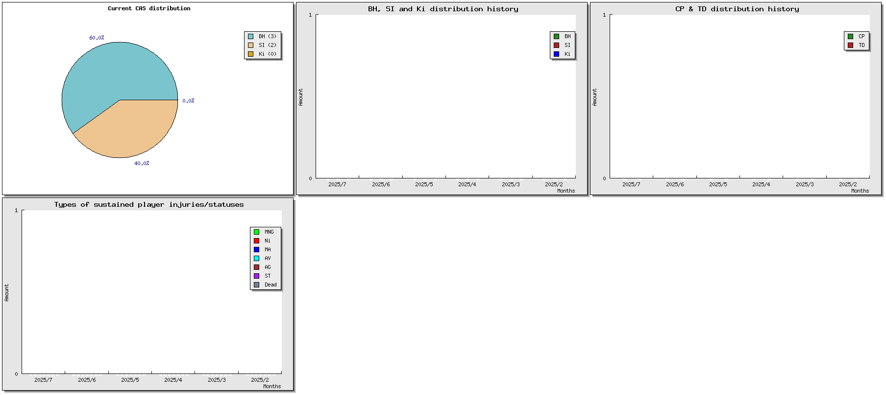| Injuries | Tournament | Opponent | MVP | Cp | Td | Int | Cas | Score | Result | Date played | Match |
