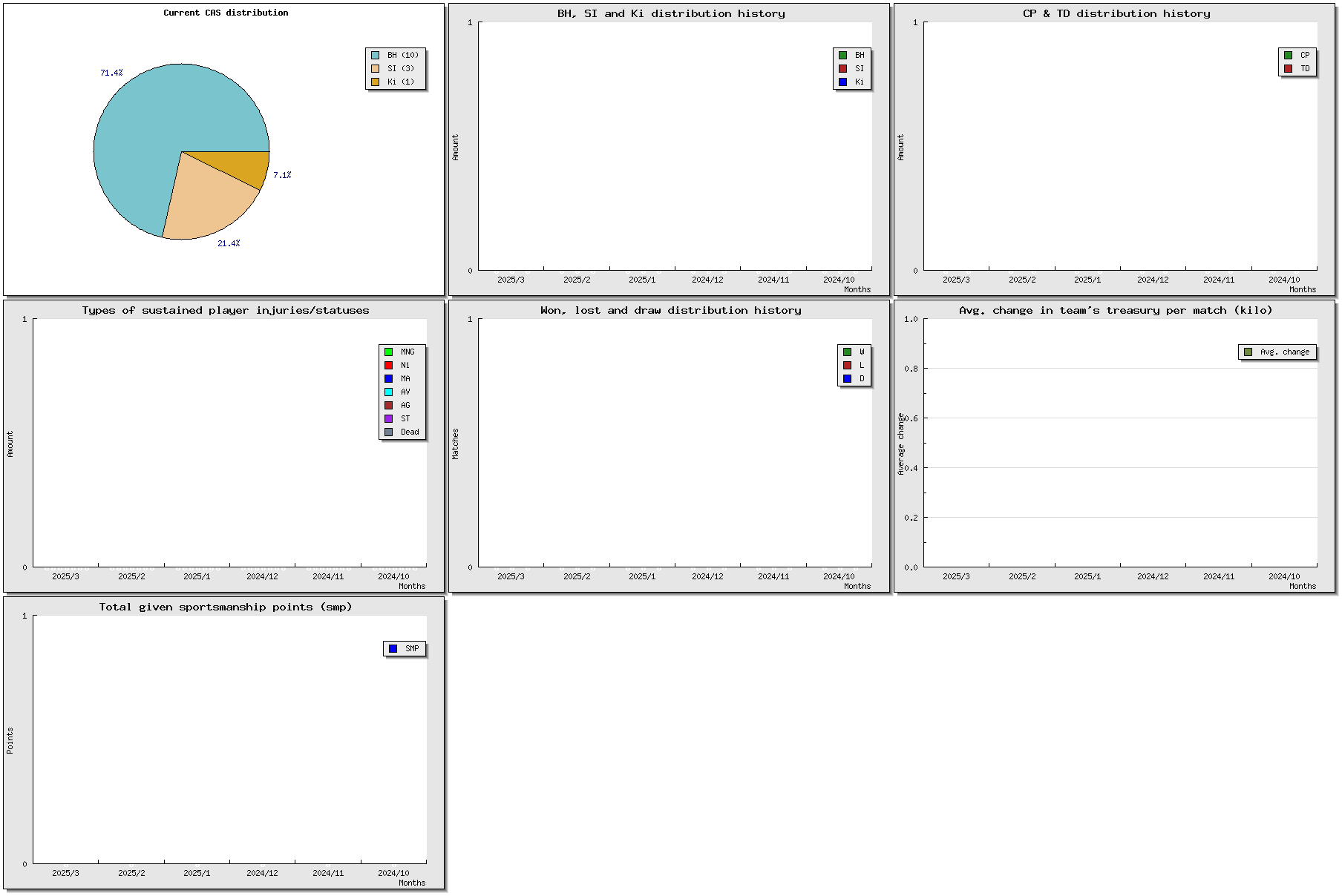 | # | Name | Position | Ma | St | Ag | Av | Skills | Injuries | Cp | Td | Int | Cas | MVP | SPP | Value |
