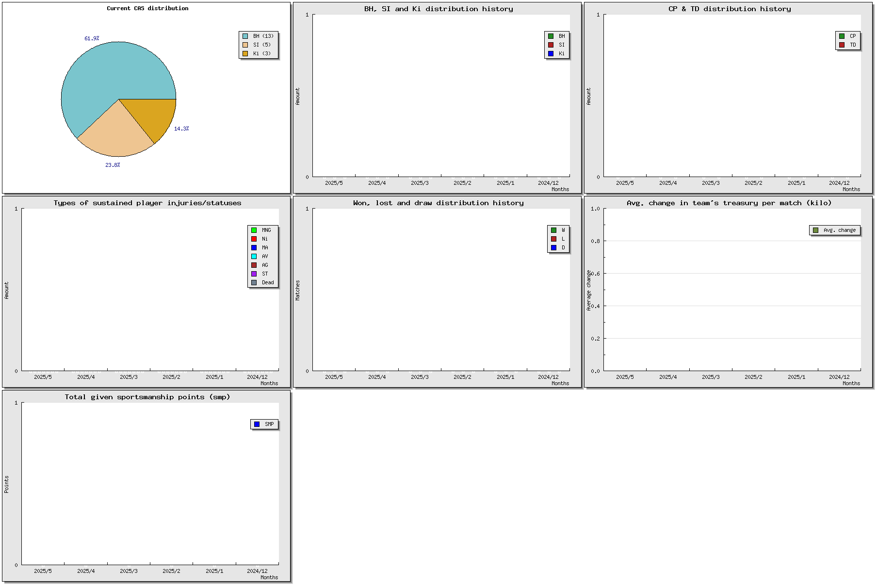 | # | Name | Position | Ma | St | Ag | Av | Skills | Injuries | Cp | Td | Int | Cas | MVP | SPP | Value |