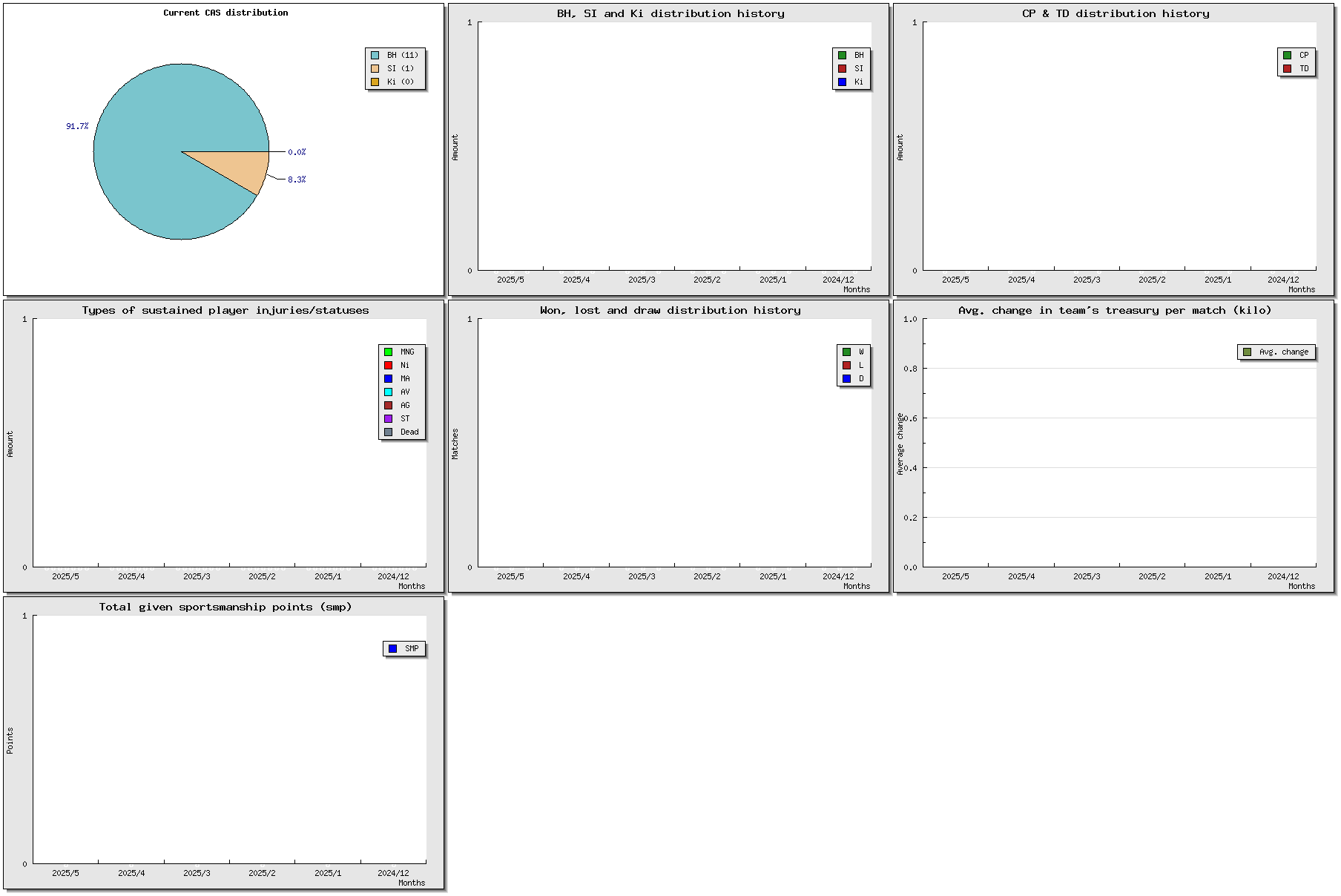 | # | Name | Position | Ma | St | Ag | Av | Skills | Injuries | Cp | Td | Int | BH/SI/Ki | MVP | SPP/extra | Value | ||