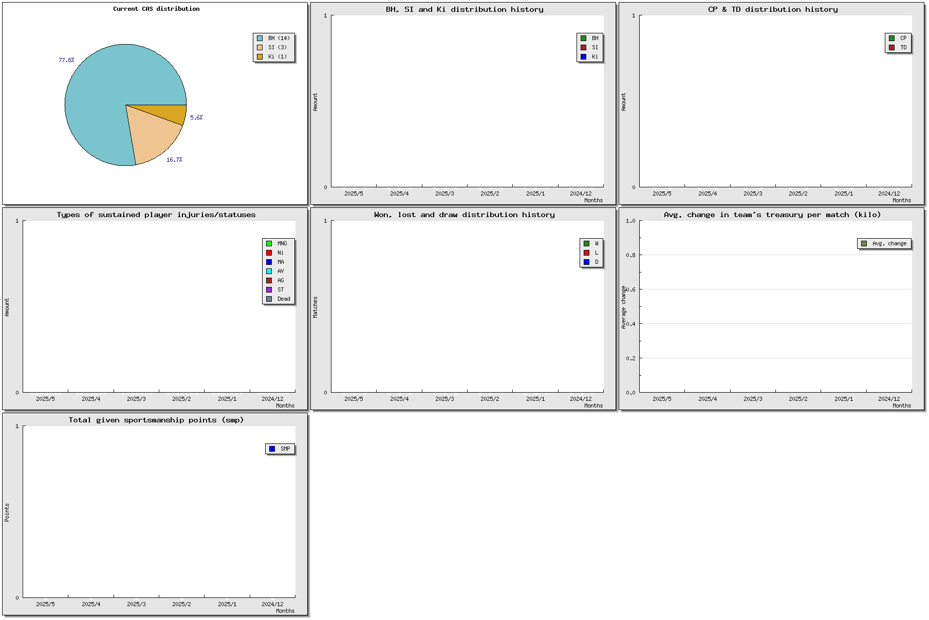 | # | Name | Position | Ma | St | Ag | Av | Skills | Injuries | Cp | Td | Int | Cas | MVP | SPP | Value | ||