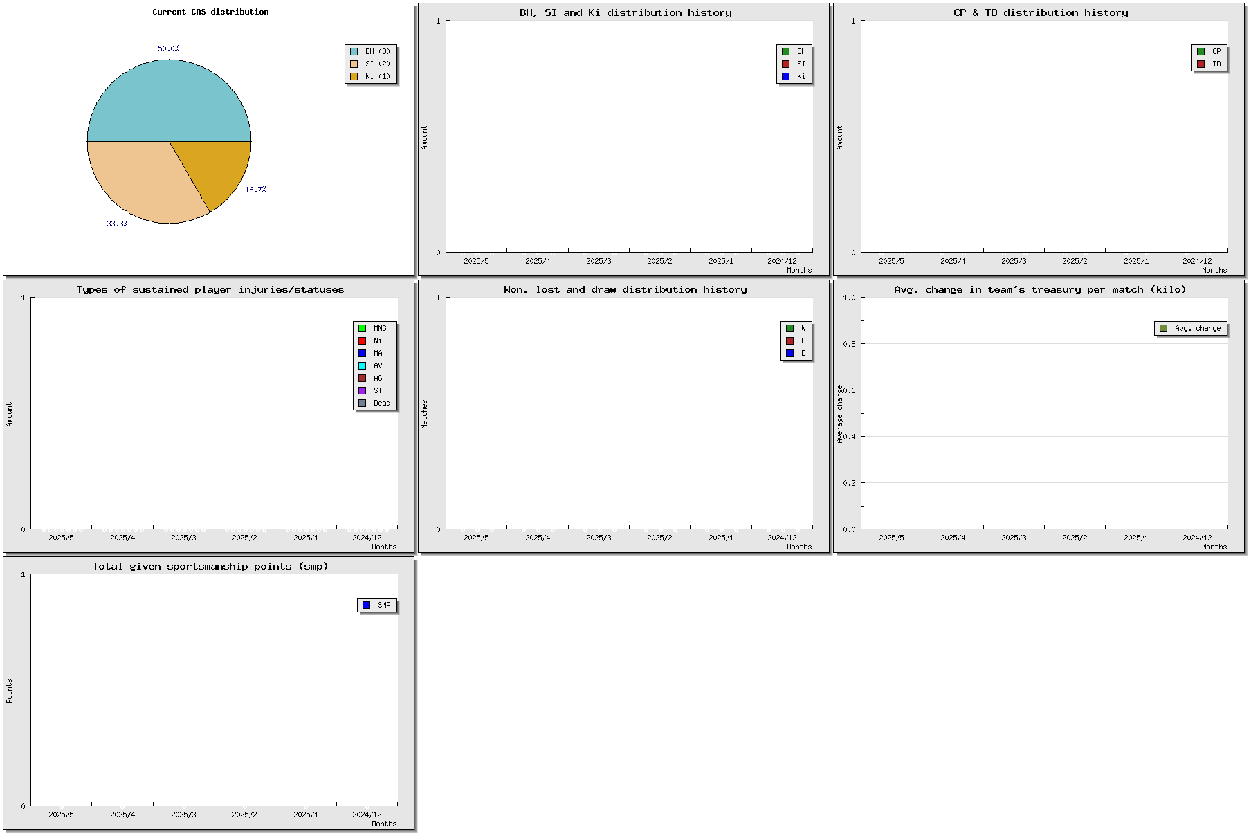 | # | Name | Position | Ma | St | Ag | Av | Skills | Injuries | Cp | Td | Int | Cas | MVP | SPP | Value | ||