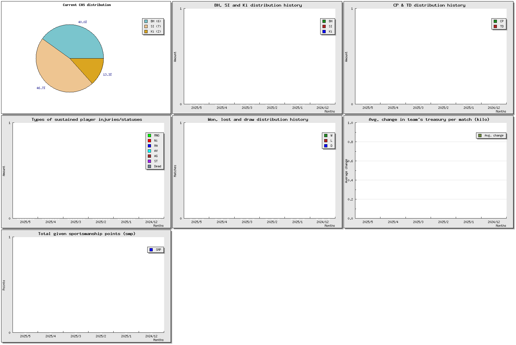 | # | Name | Position | Ma | St | Ag | Av | Skills | Injuries | Cp | Td | Int | Cas | MVP | SPP | Value | ||