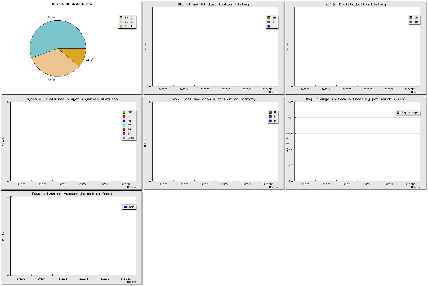 | # | Name | Position | Ma | St | Ag | Av | Skills | Injuries | Cp | Td | Int | Cas | MVP | SPP | Value |