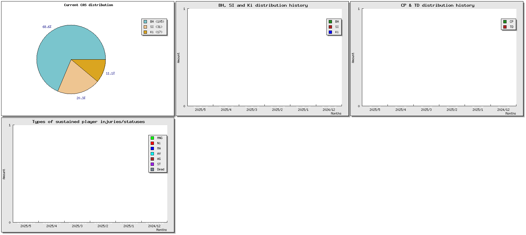 | # | Name | Race | Value | W | D | L | GP | WIN% | SW | SD | SL | GF | GA | Td | Cp | Int | Cas | BH | Si | Ki | tcasf | tcasa | tcdiff | SMP | WT | ELO |